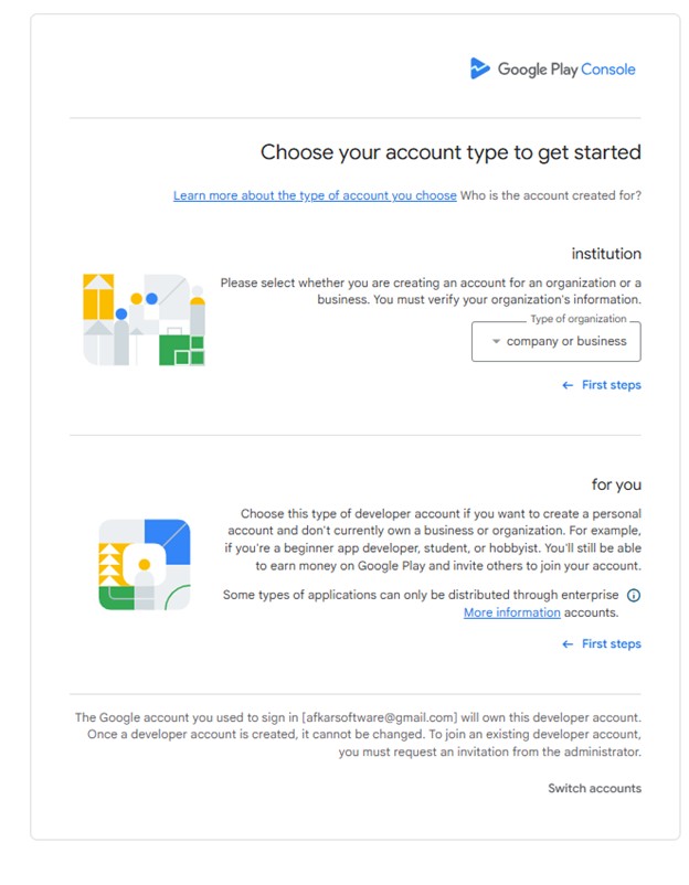 The first step in registration is choosing the account type. Personal Account: This account is for individual developers to upload their apps and requires a closed test with 12 testers before publishing the app. Organization Account (Company): This account type is for companies, and a D-U-N-S number is a basic requirement to open the account.