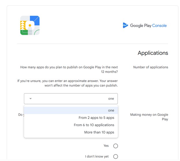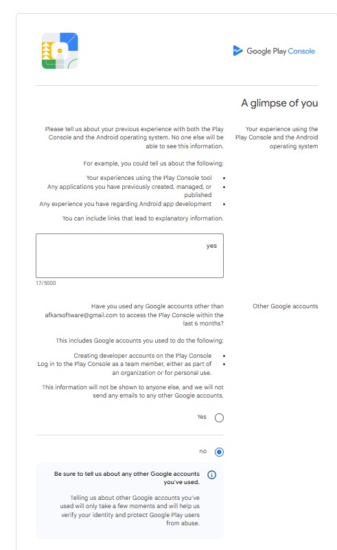 - If you choose No: You are confirming that this is your only account on the Google Play Console.