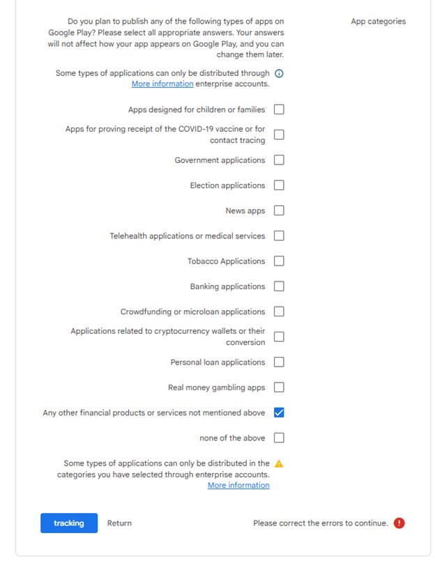 Do you plan to publish any of the following types of applications on the Google Play Store? Please select all that apply.